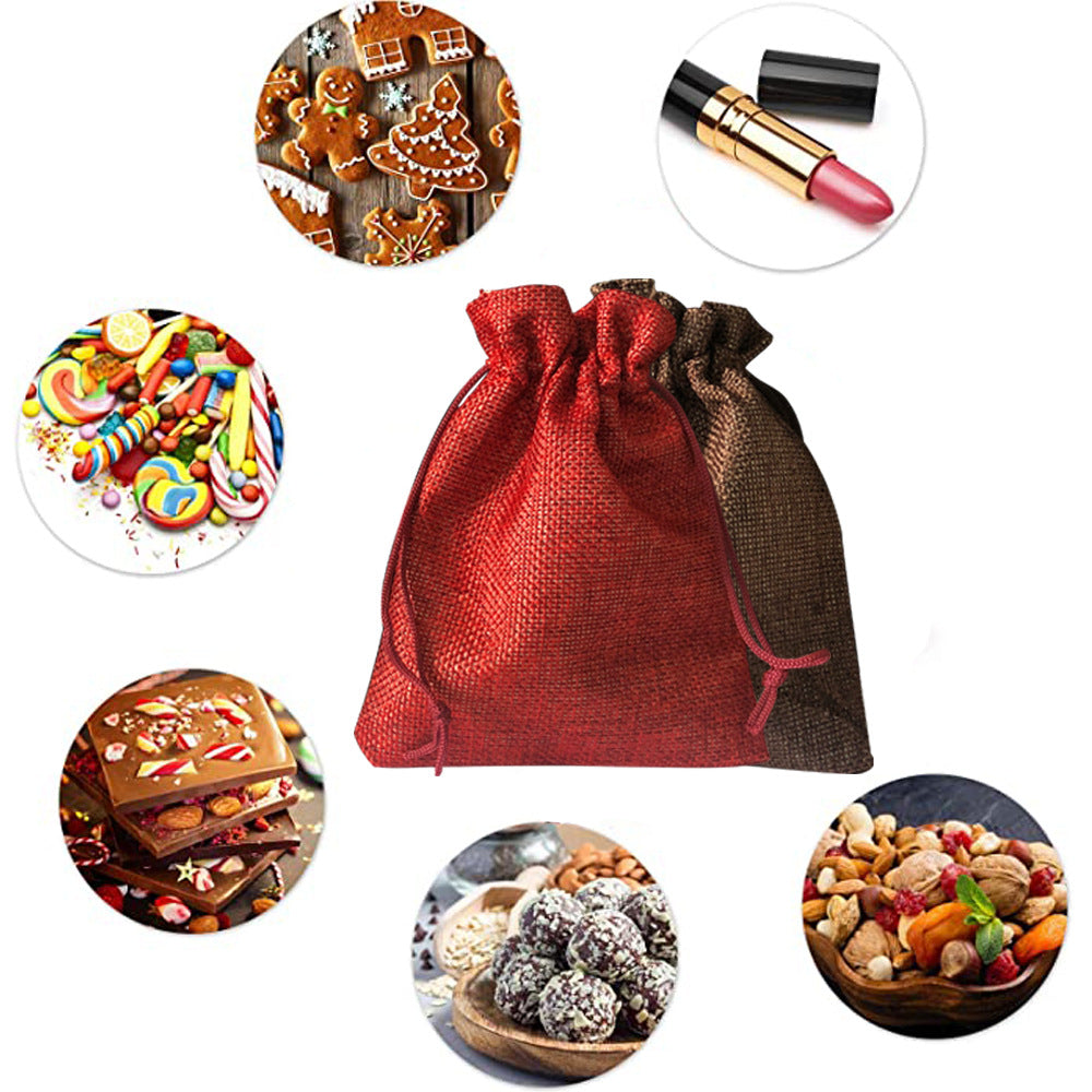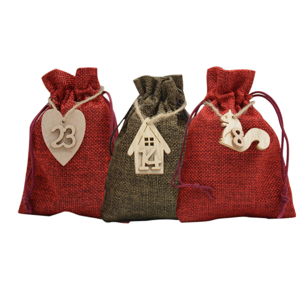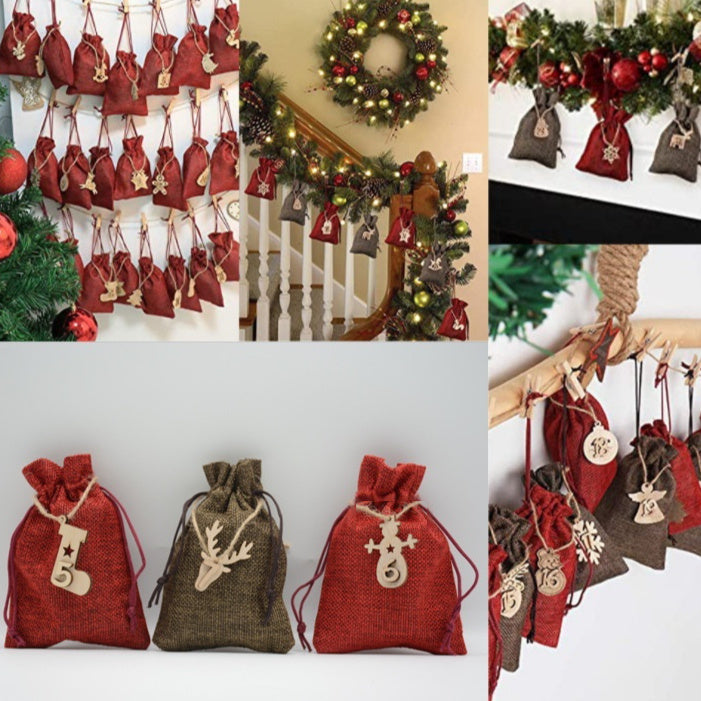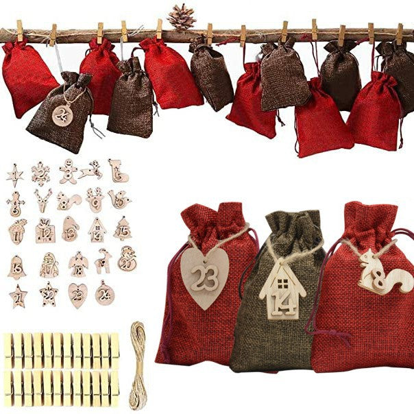 This festive advent collection combines natural linen construction with thoughtful design for seasonal gifting and storage. The set includes 24 premium linen bags in burgundy and coffee tones, complemented by wooden clips, labels, and hemp rope for versatile display options. Each bag measures 10x14cm, crafted from durable 280g linen material. Perfect for organizing treats, small gifts, or decorative arrangements, this comprehensive 12-piece advent system offers everything needed for an elegant holiday presentation. Includes wooden hanging ropes for flexible styling options.
